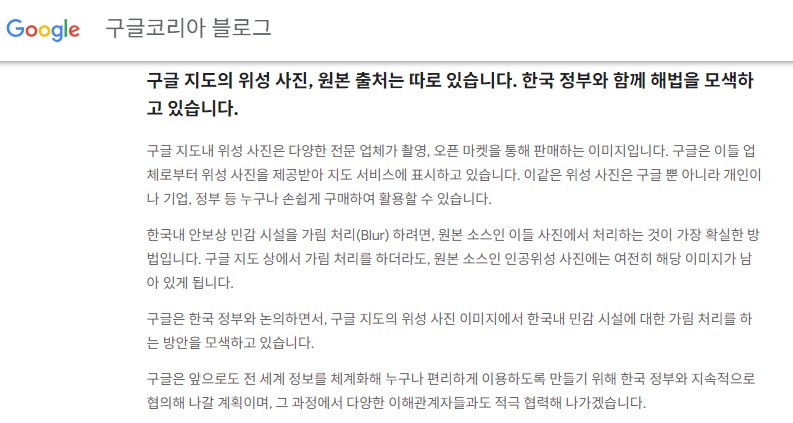 이어 "구글 지도의 위성 사진, 원본 출처는 따로 있다. 한국 정부와 함께 해법을 모색하고 있다"며 "구글 지도 내 위성 사진은 다양한 전문 업체가 촬영, 오픈 마켓을 통해 판매하는 이미지"라고 밝혔다.
