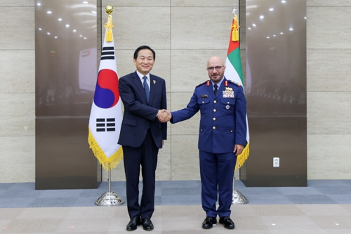 (서울=연합뉴스) 이두희 국방부 차관이 6일 국방부에서 이브라힘 나세르 모하메드 알알라위 아랍에미리트(UAE) 국방차관과 제13차 한-UAE 차관급 운영위원회를 개최, 악수하며 기념 촬영하고 있다. 2025.8.6 [국방부 제공. 재판매 및 DB 금지]