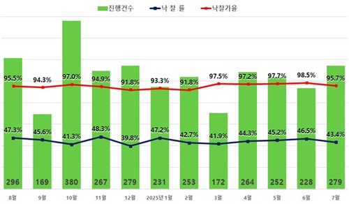 경·공매 데이터 전문기업 지지옥션이 발표한 '7월 경매동향보고서'에 따르면 7월 서울 아파트 낙찰가율은 95.7%로 전월보다 2.8%포인트 하락했습니다.