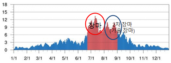 기후학적으로 한반도 여름철 강수는 크게 2~3차례 집중 시기로 구분됩니다.