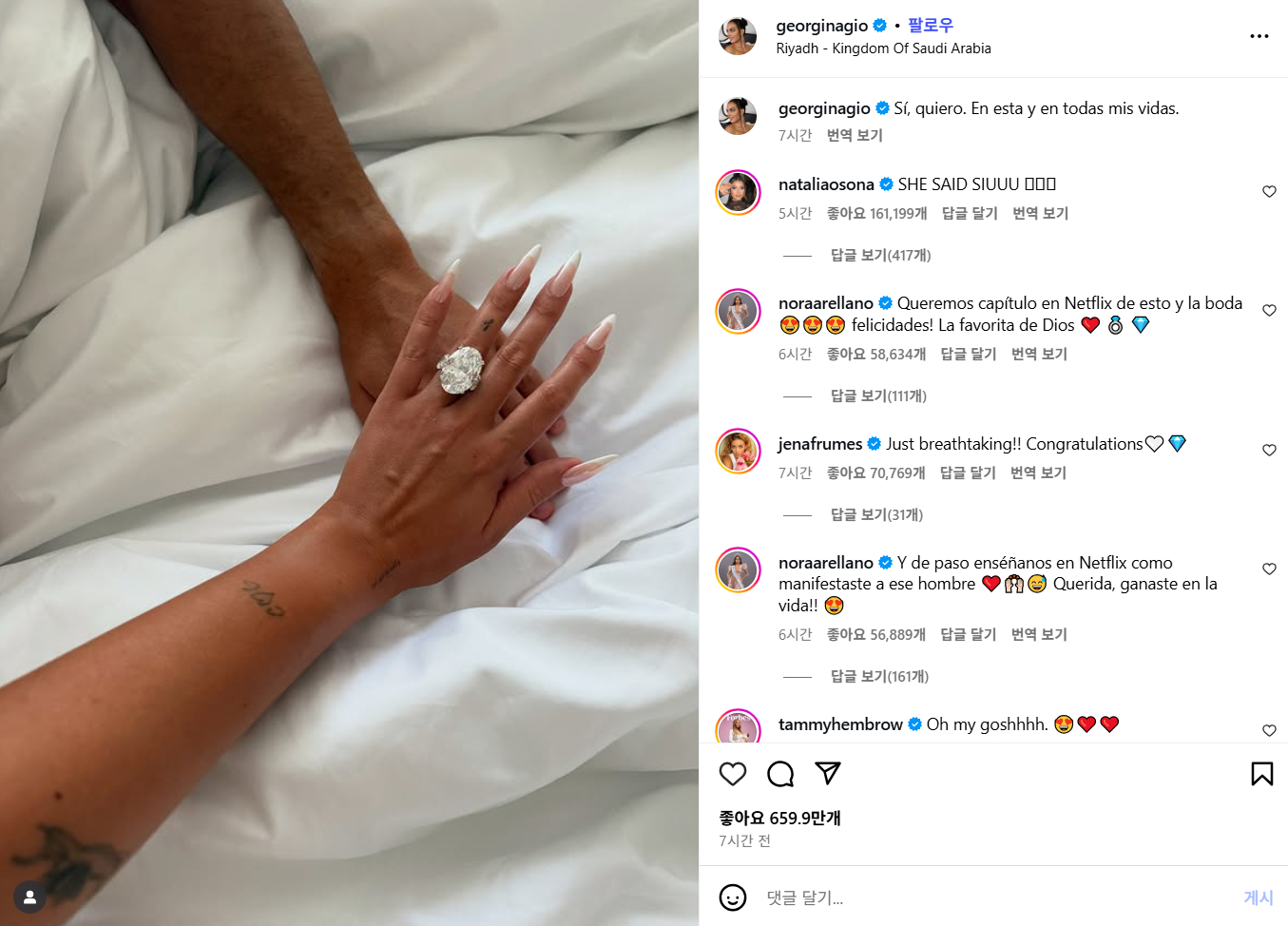 호날두로 추정되는 남성의 손 위로 반지 낀 손을 겹쳐 올린 조지나는 프로포즈 승낙을 암시하는 듯 "그럴게요. 이번 삶에서, 모든 삶에서"라는 문구를 남겼습니다.
