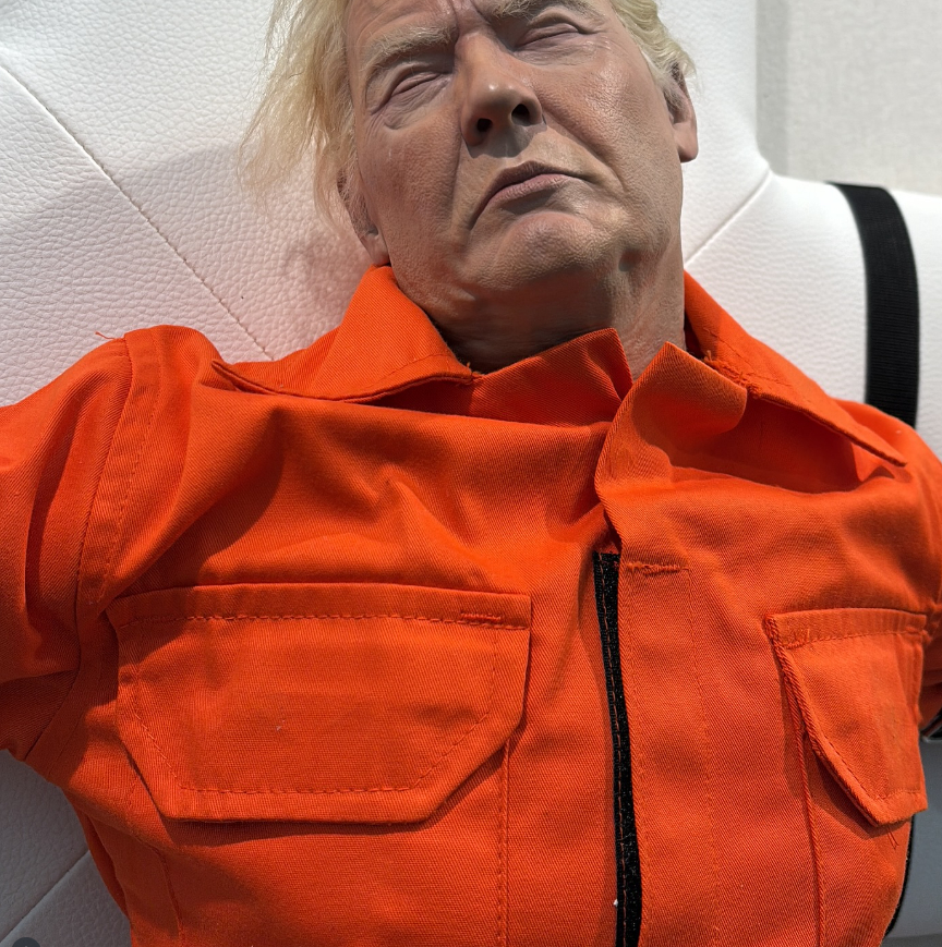 트럼프 조각상 앞에서 자세를 취하는 제이슨 스톰 작가[사진 출처 = 인스타그램][사진 출처 = 인스타그램]이 작품은 주황색 죄수복을 입은 트럼프 대통령이 팔다리가 묶인 채 십자가에 매달려 얼굴을 찡그리는 모습을 형상화한 조각상입니다.