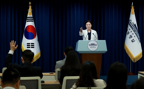 (서울=연합뉴스) 홍해인 기자 = 강유정 대통령실 대변인이 14일 서울 용산 대통령실 청사에서 15일 예정된 국민임명식 등 현안 브리핑 뒤 취재진 질문을 받고 있다. 2025.8.14