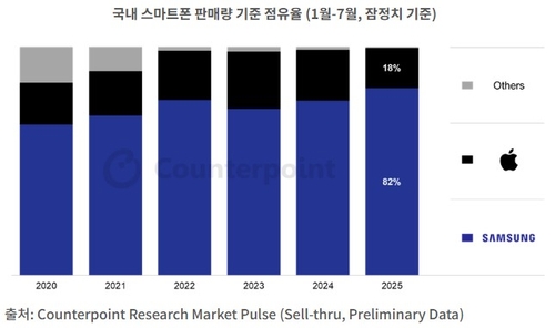 시장조사업체 카운터포인트리서치가 발표한 잠정 집계에 따르면 1∼7월 국내 스마트폰 누적 판매량 점유율에서 삼성전자는 82%로 1위를 기록했고, 애플은 18%로 뒤를 이었습니다.