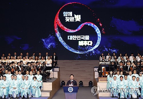 이재명 대통령, 80주년 광복절 경축사(서울=연합뉴스) 홍해인 기자 = 이재명 대통령이 15일 서울 세종문화회관에서 열린 80주년 광복절 경축식에서 경축사를 하고 있다. 2025.8.15 [대통령실통신사진기자단] hihong@yna.co.kr(서울=연합뉴스) 홍해인 기자 = 이재명 대통령이 15일 서울 세종문화회관에서 열린 80주년 광복절 경축식에서 경축사를 하고 있다. 2025.8.15 [대통령실통신사진기자단] hihong@yna.co.kr