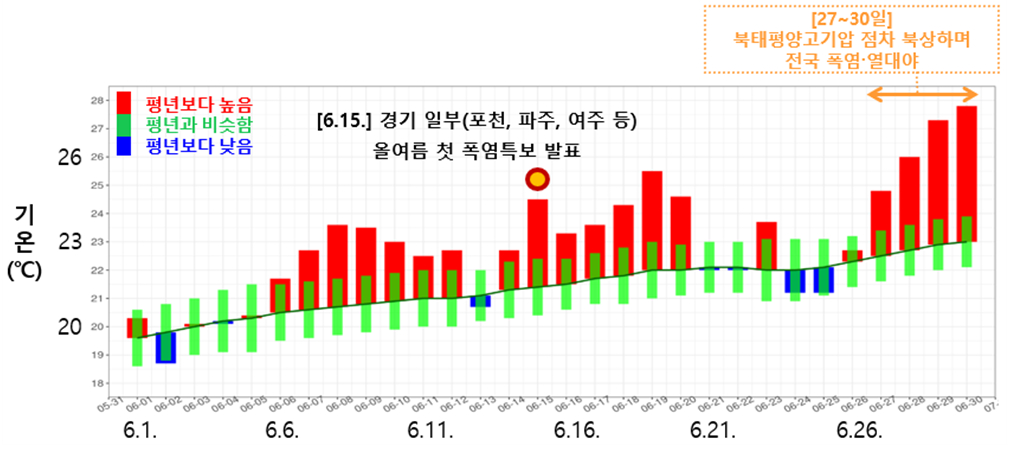 6월 일별 전국 평균기온 시계열[기상청 제공][기상청 제공]올여름 태풍이 한반도까지 올라오지 못하는 건 일찍 시작한 폭염 때문입니다.