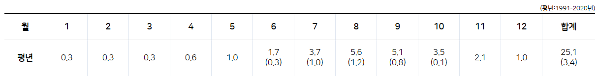 과거 30년 평균 태풍 발생 현황에 따르면, 평년 9월에 0.8개, 10월에도 0.1개의 태풍이 우리나라에 영향을 주고 있습니다.