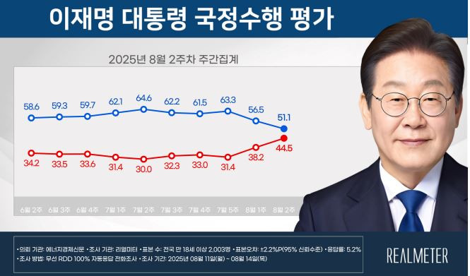 리얼미터가 에너지경제신문 의뢰로 지난 11~14일 전국 18세 이상 유권자 2,003명을 대상으로 조사한 결과 이 대통령의 국정수행에 대해 '잘함'이라고 평가한 응답자는 전주 대비 5.4%포인트 하락한 51.1%로 나타났습니다.