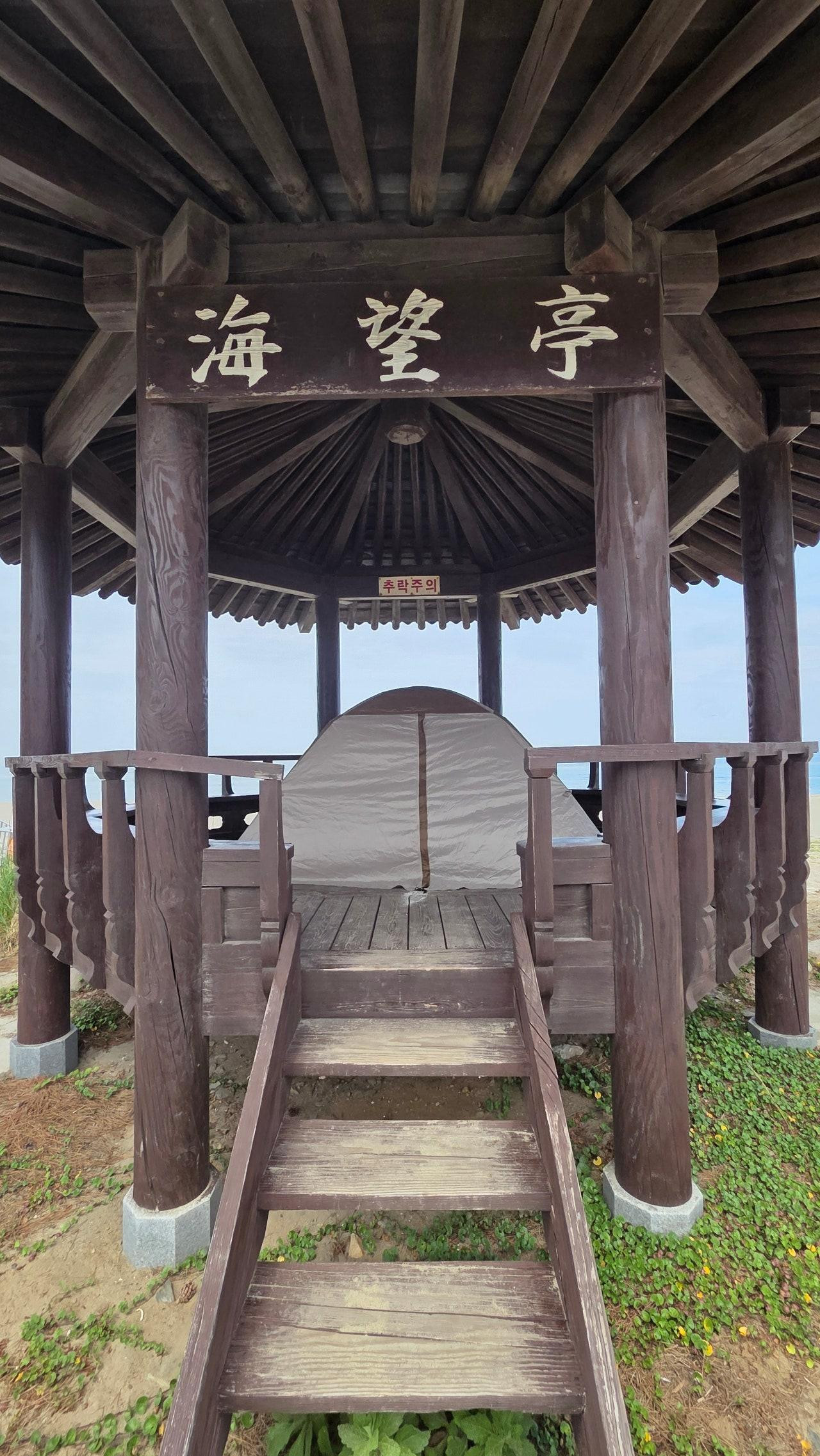해당 글에는 삼척 하맹방 해변에 있는 정자 '해망정'을 촬영한 사진이 첨부돼 있었는데, 정자 한가운데에는 텐트가 설치돼 있습니다.