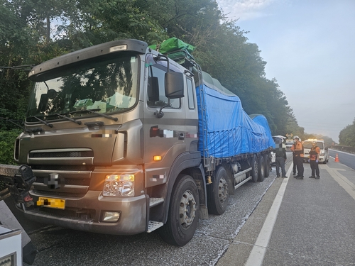 오늘(19일) 오전 5시 40분쯤, 경남 하동군 진교면 남해고속도로 부산 방면을 달리던 SUV 차량이 도로에 쏟아진 플라스틱 알갱이에 미끄러져 갓길에 정차한 25t 화물차를 들이받았습니다.