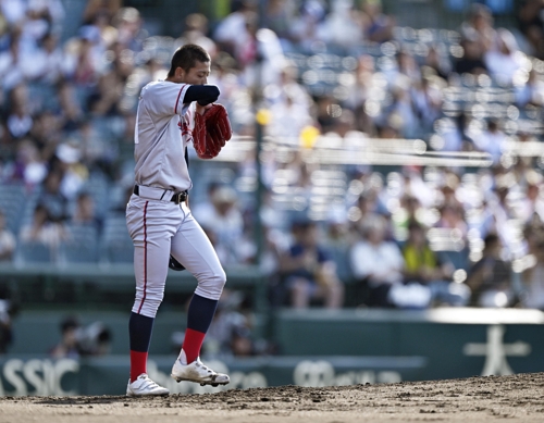 땀 닦는 교토국제고 투수 니시무라(니시노미야[일본] 교도=연합뉴스)(니시노미야[일본] 교도=연합뉴스)