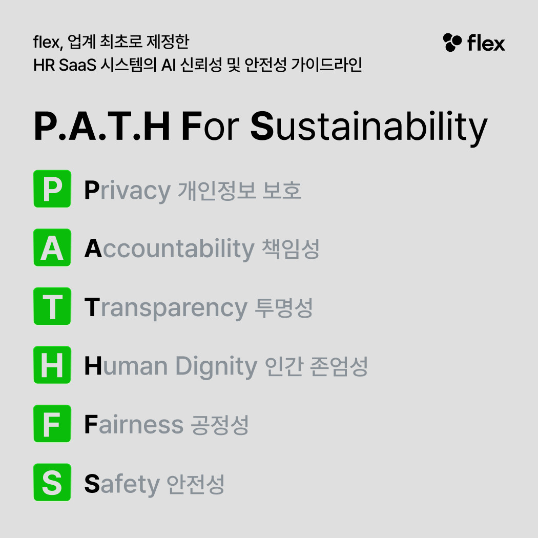 HR SaaS 시스템의 AI 신뢰성 및 안전성 가이드라인(flex)[Flex 제공][Flex 제공]AI 기반 HR SaaS(Software as a Service) 기업 플렉스가 국내 HR SaaS 업계 최초로 6대 윤리원칙 ‘P.A.T.H. For Sustainability’를 골자로 하는 ‘HR SaaS 시스템의 AI 신뢰성 및 안전성 가이드라인’을 제정 및 공포했다고 오늘(20일) 밝혔습니다.