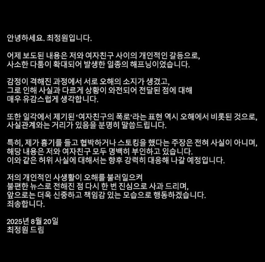 최정원은 오늘(20일) SNS에 "제가 흉기를 들고 협박하거나 스토킹했다는 주장은 전혀 사실이 아니다"라며 "해당 내용은 저와 여자친구 모두 명백히 부인하고 있다"고 해명했습니다.