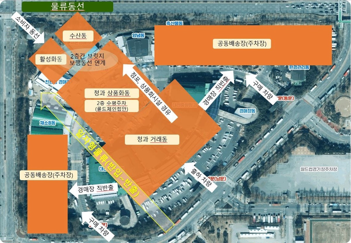 주요 개선 방향은 ▲ 농산물 반입·반출장 분리와 일방향 물류동선 구축 ▲ 경매장과 중도매인 점포 기능별 분리 신축 ▲ 선별·소분·포장·배송이 원스톱으로 가능한 상품화·풀필먼트 기능 도입 ▲ 공동 배송장 신설을 통한 물류 효율화 등입니다.