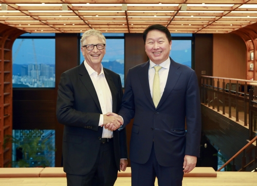 최태원 회장, 빌 게이츠 이사장과 만나최태원 SK 회장과 빌 게이츠 게이츠재단 이사장이 지난 21일 서울 종로구 SK서린빌딩에서 악수를 하고 있다. [SK 수펙스추구협의회 제공]최태원 SK 회장과 빌 게이츠 게이츠재단 이사장이 지난 21일 서울 종로구 SK서린빌딩에서 악수를 하고 있다. [SK 수펙스추구협의회 제공]