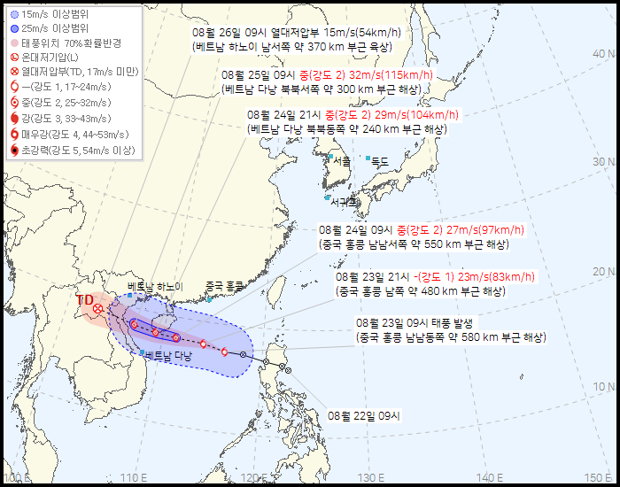 태풍 '가지키'는 24일 베트남 다낭 북동쪽 약 240㎞ 해상으로 진출하겠고, 25일쯤 다낭 북쪽 지역에 상륙할 것으로 예상됩니다.