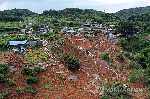 집중호우·산사태로 매몰된 경남 산청군 마을[연합뉴스 자료사진][연합뉴스 자료사진]중부 지방과 호남으로 많은 비가 내리는 가운데, 경기도 연천군에는 산사태 경보가 발표됐습니다.