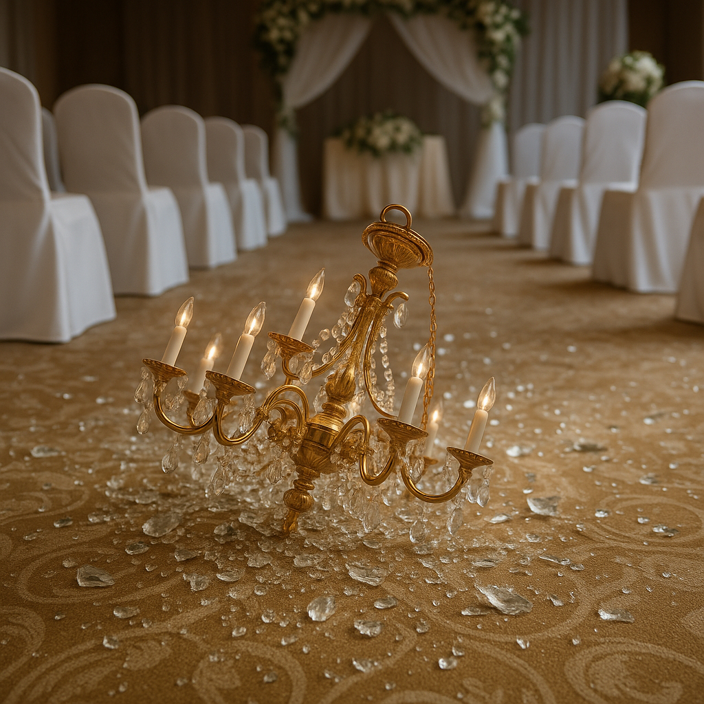 당시 한 하객은 천장에서 떨어진 샹들리에에 머리를 맞았고 다른 하객은 바닥에서 튀어 오른 유리 파편에 다리를 다쳤습니다.