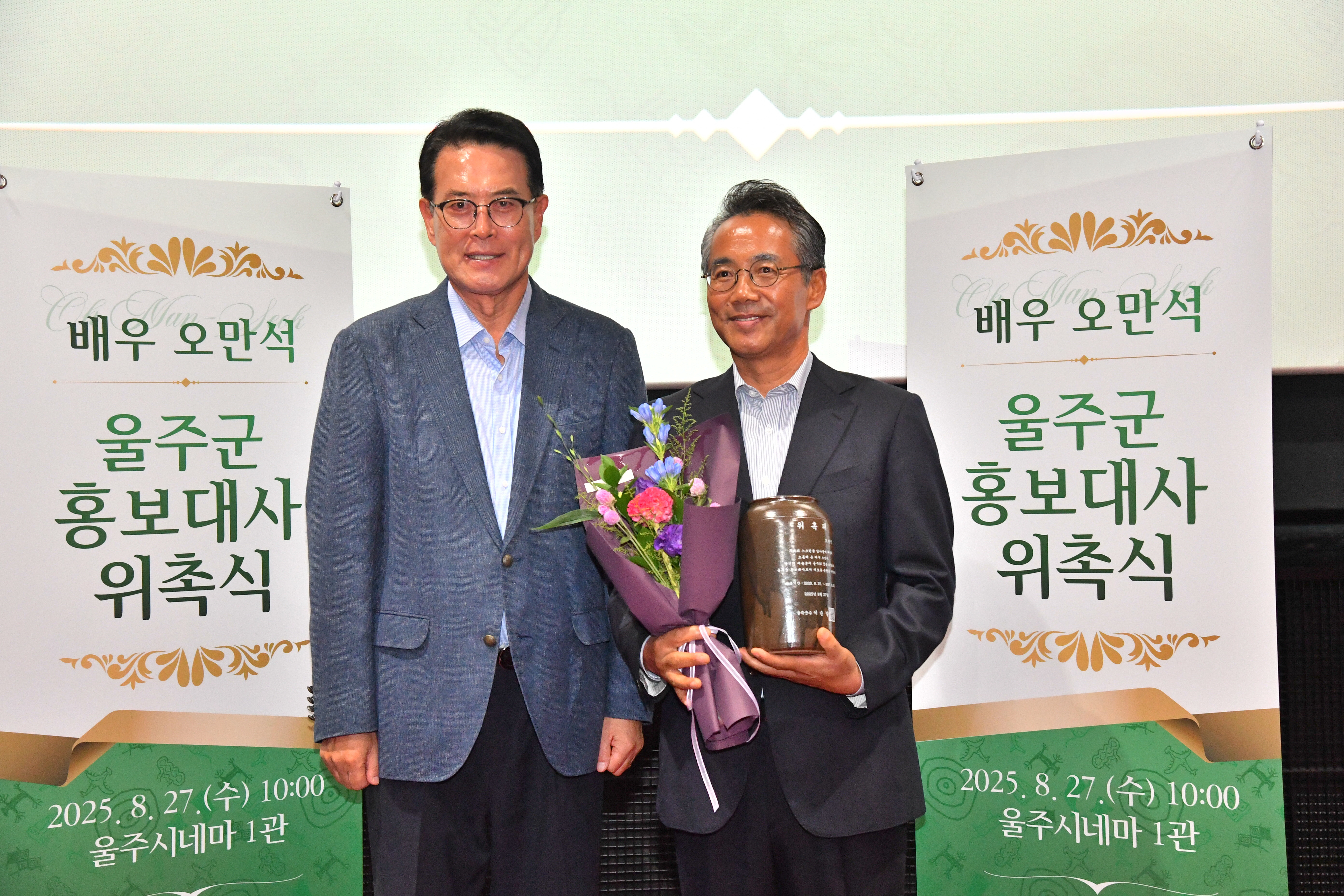 이순걸 군수는 “오만석 배우의 따뜻한 마음과 감동의 연기가 울주군 문화·예술의 품격뿐 아니라 대내외 위상을 높여주리라 기대한다”라며 “울주에 대한 사랑과 왕성한 활동으로 우리 울주군을 알리는 든든한 힘이 돼주길 바란다”라고 전했습니다.