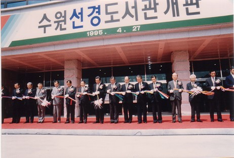 1995년 4월 진행된 선경도서관 개관식[SK그룹 제공][SK그룹 제공]SK그룹은 1989년 법원과 경찰청 등이 사용하던 팔달산 자락의 1만1,830㎡ 부지를 매입해 1991년 수원시에 기증하고, 2년 후 착공을 시작해 1995년 건물을 지어 통째로 기부했습니다.