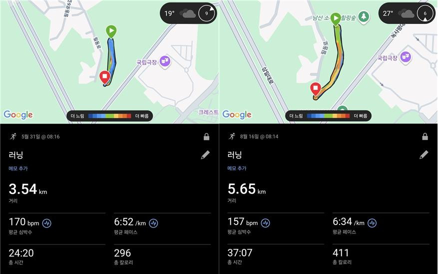5월 31일과 8월 16일 인터벌 훈련 결과 비교거리와 소요시간은 늘었지만 페이스는 줄었고 심박수도 안정적으로 낮춰졌다.거리와 소요시간은 늘었지만 페이스는 줄었고 심박수도 안정적으로 낮춰졌다.