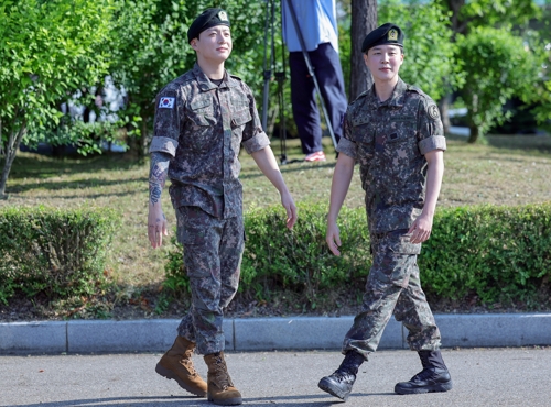 BTS 지민·정국 제대육군 병장으로 만기 전역한 BTS 지민과 정국이 11일 경기 연천군 연천공설운동장에서 열린 기념행사에서 팬들의 환호에 웃고 있다. 2025.6.11 [연합뉴스 제공]육군 병장으로 만기 전역한 BTS 지민과 정국이 11일 경기 연천군 연천공설운동장에서 열린 기념행사에서 팬들의 환호에 웃고 있다. 2025.6.11 [연합뉴스 제공]