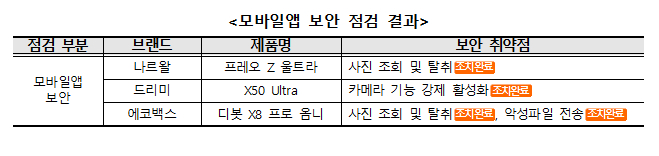 모바일앱 보안 점검 결과, 나르왈, 드리미, 에코백스 3개 제품은 사용자 인증 절차가 미비해 불법적인 접근이나 조작 가능성이 있었습니다.