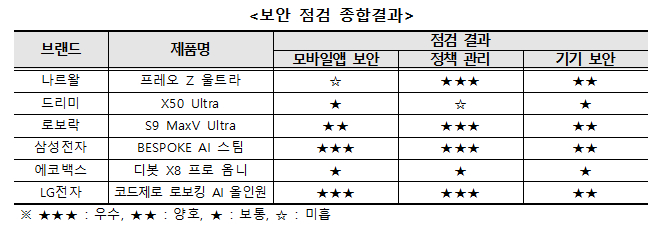 기기 보안 점검에서는 드리미, 에코백스 2개 제품의 하드웨어 보안 수준이 상대적으로 낮았습니다.