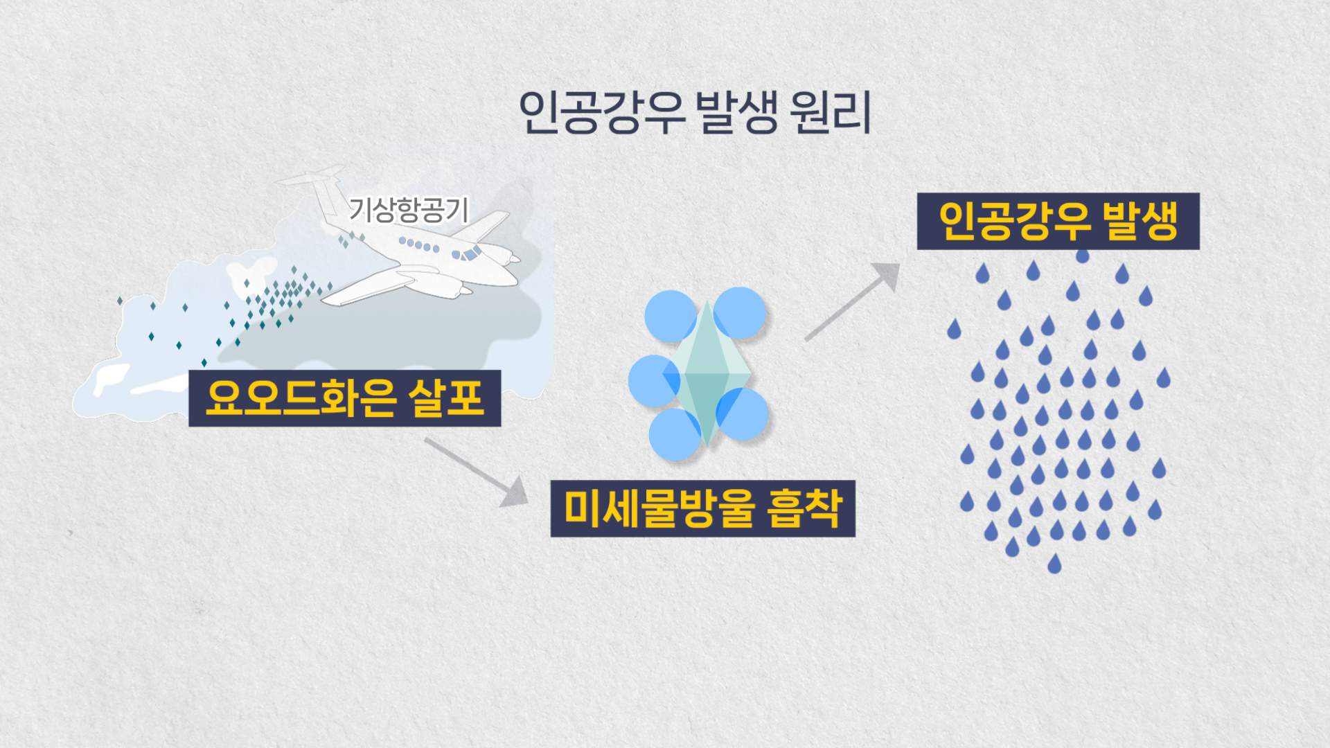 먼저 인공강우는 구름에 '요오드화 은' 같은 화학 씨앗을 뿌려 비를 내리게 하는 실험입니다.