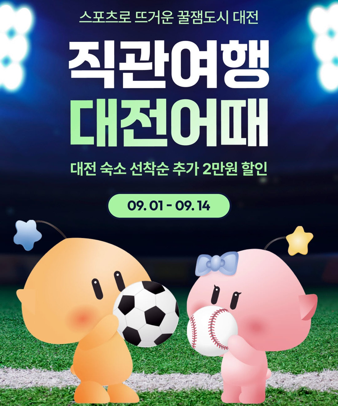 숙박 할인 프로모션 '직관여행 대전어때' 포스터[대전관광공사 제공. 재판매 및 DB 금지][대전관광공사 제공. 재판매 및 DB 금지]대전관광공사는 오늘(2일)부터 2주간 여행·여가 플랫폼 여기어때와 함께 대전 숙박 할인 혜택을 제공하는 '직관여행 대전어때' 프로모션을 운영한다고 밝혔습니다.