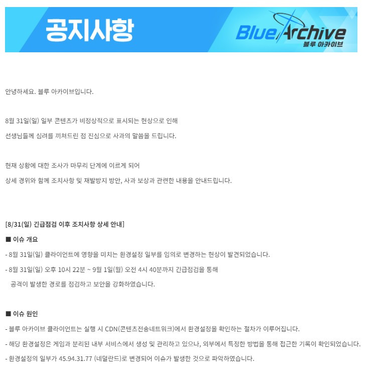 운영진에 따르면 '블루 아카이브' 클라이언트는 실행 시 콘텐츠 전송 네트워크(CDN)를 통해 환경설정을 확인합니다.