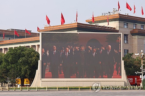 앞서 김정은 위원장, 시진핑 주석, 블라디미르 푸틴 러시아 대통령 등 북중러 정상은 서로 악수한 뒤 나란히 걸어 행사장으로 입장했습니다.