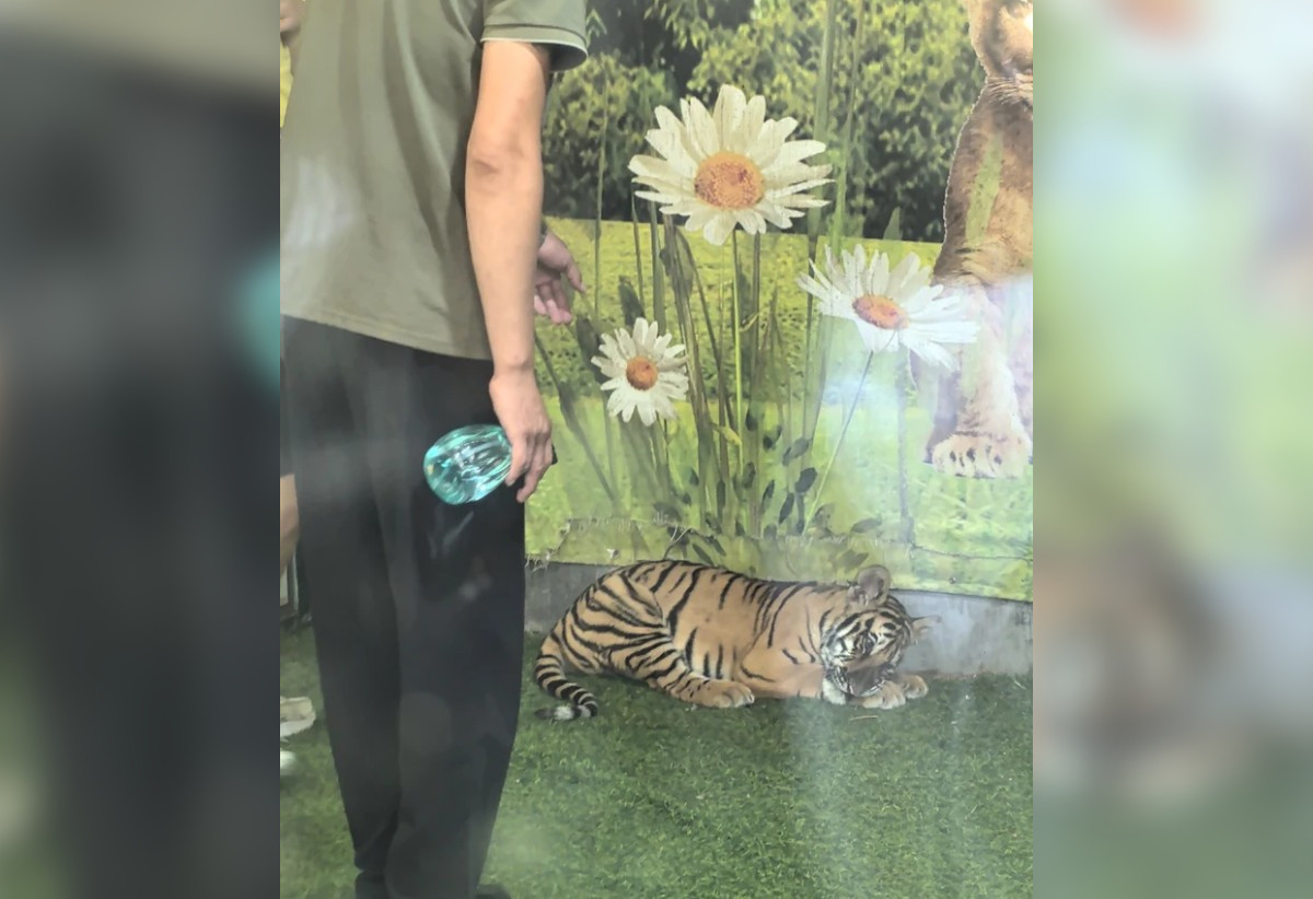 글과 함께 올라온 사진에는 땅바닥 엎드린 새끼 호랑이와 분무기를 들고 서 있는 직원의 모습이 담겨 있었습니다.