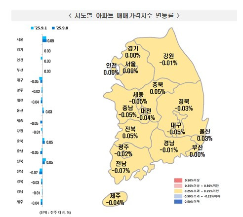 5대 광역시(-0.03%→-0.02%)는 내림세가 소폭 줄었고, 8개 도(-0.01%→-0.01%)는 유지됐으며, 세종시는 직전 주 보합에서 0.05% 하락으로 돌아섰습니다.