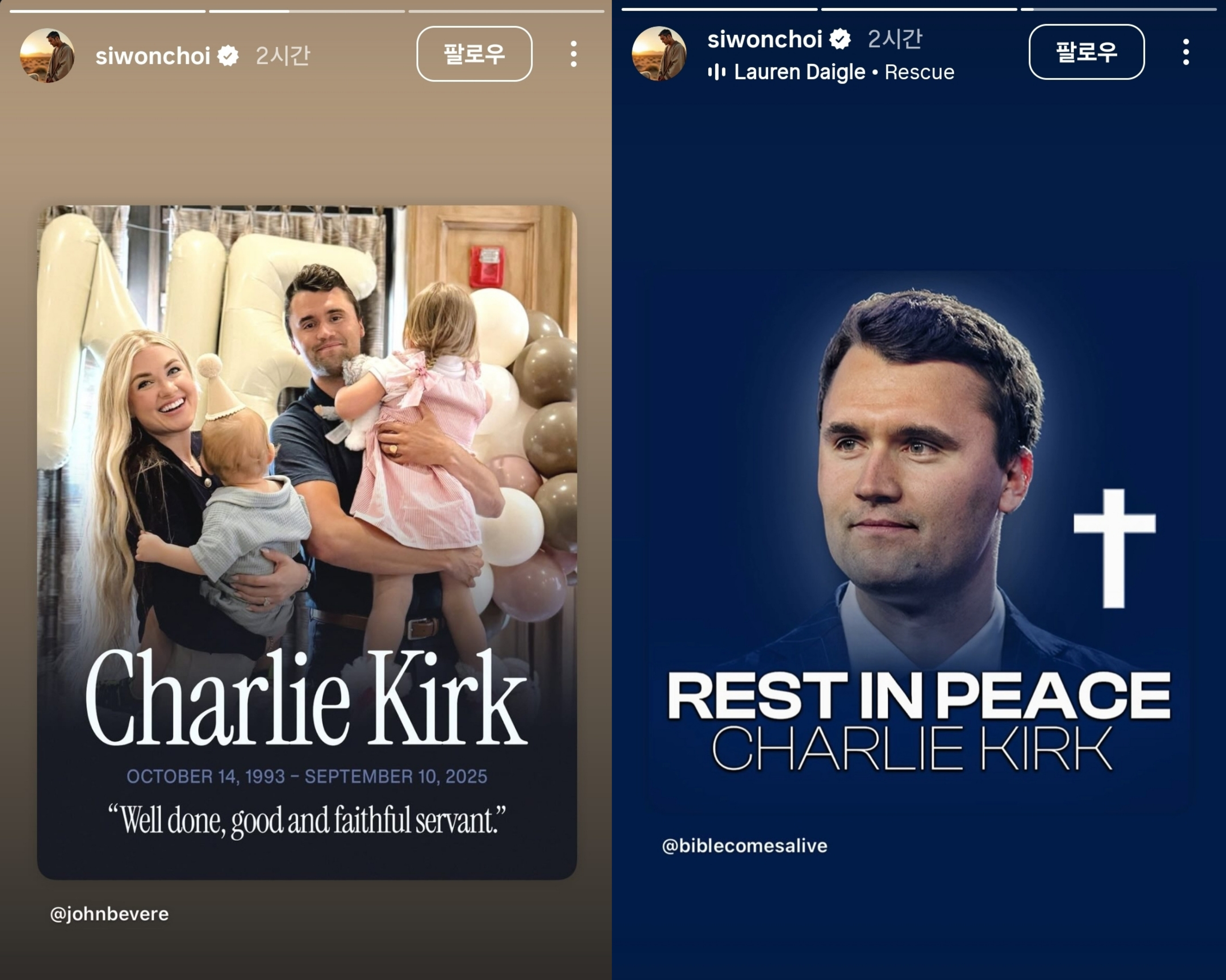 슈퍼주니어 최시원 씨가 공유한 찰리 커크 추모글[인스타그램 캡처][인스타그램 캡처]도널드 트럼프 미국 대통령을 지지하는 보수단체 대표 찰리 커크(31)가 총격으로 숨진 가운데, 유명 연예인들이 잇따라 그를 추모하는 글을 올리고 있습니다.