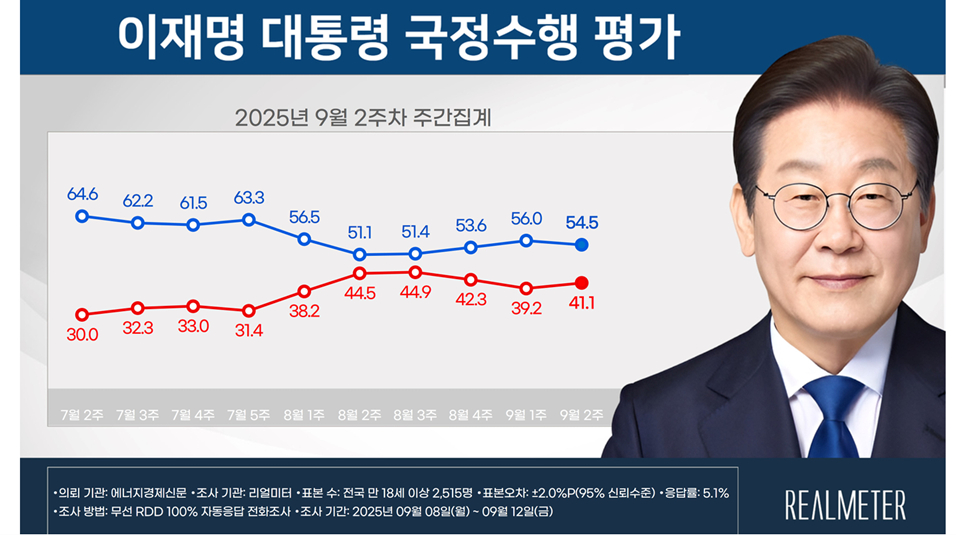 리얼미터가 에너지경제신문 의뢰로 지난 8일부터 12일까지 전국 18세 이상 유권자 2,515명을 대상으로 조사한 결과, 이 대통령의 국정수행을 긍정적으로 평가한 응답자는 54.5%로 나타났습니다.