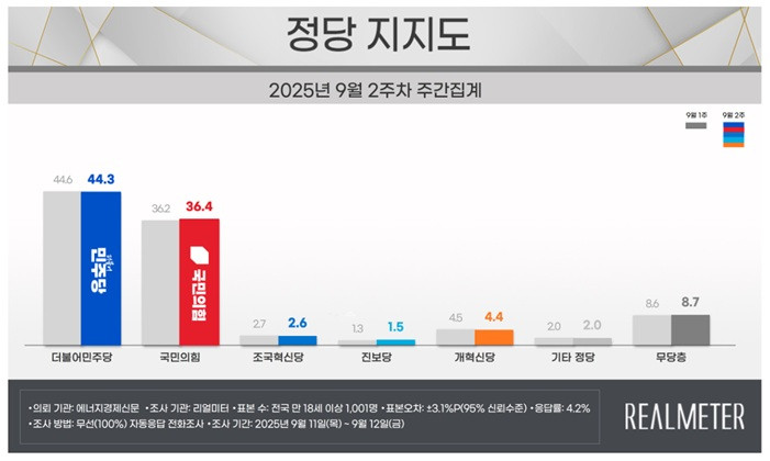 지난 11일부터 이틀간 전국 18세 이상 유권자 1,001명을 대상으로 진행한 정당 지지도 조사에서는 더불어민주당이 44.3%, 국민의힘이 36.4%로 각각 집계됐습니다.