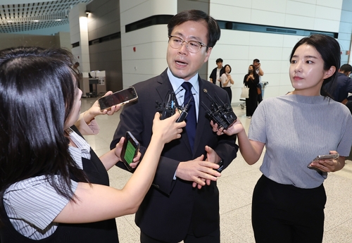 (영종도=연합뉴스) 김성민 기자 = 여한구 산업통상자원부 통상교섭본부장이 15일 미국과의 관세 협상 후속 협의를 위해 인천국제공항 제2터미널로 출국하기 전 취재진 질문에 답하고 있다. 2025.9.15