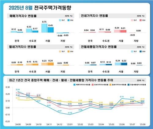 오늘(15일) 한국부동산원이 발표한 8월 전국 주택가격 동향 조사 결과에 따르면 서울의 주택종합(아파트·연립주택·단독주택 포함) 매매가격지수는 전월(7월) 대비 0.45% 상승했습니다.