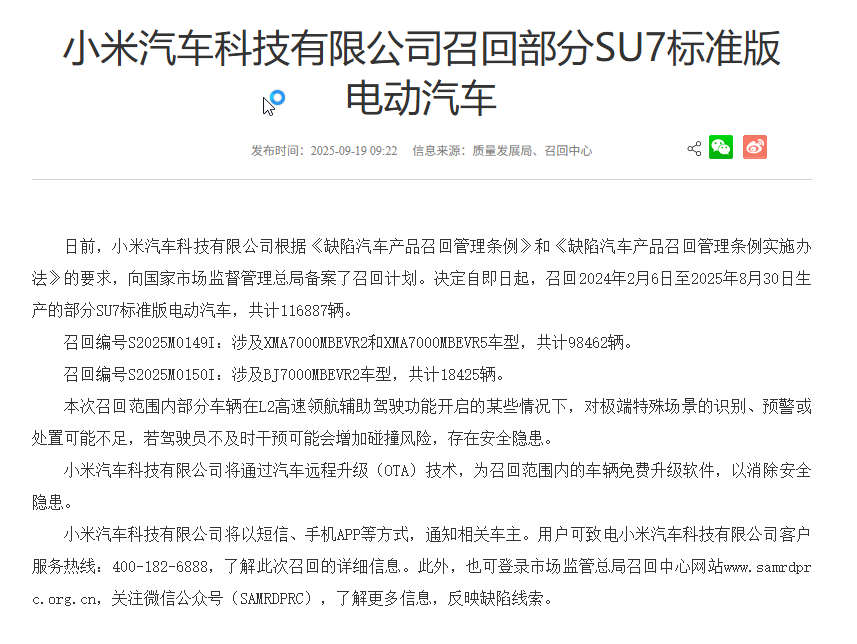 국가시장감독관리총국은 오늘(19일) 공고를 통해 샤오미가 지난 8월 30일까지 생산된 SU7 전기차 11만6,900대에 대한 리콜 결정을 승인했다고 밝혔습니다.