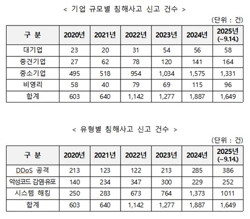 KISA가 집계한 기업 규모별·유형별 침해사고 신고 건수.더불어민주당 황정아 의원실 제공.더불어민주당 황정아 의원실 제공.최근 6년간 기업이 당국에 신고한 사이버 침해 사고가 7천건을 넘어선 것으로 나타났습니다.