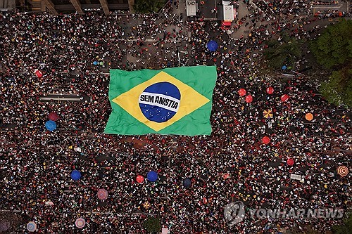 21일(현지시간) 상파울루에서 펼쳐진 브라질 전 대통령 사면 추진 반대 시위[상파울루 로이터=연합뉴스 제공][상파울루 로이터=연합뉴스 제공]브라질에서 자이르 보우소나루(70) 전 대통령(2019~2022년 재임) 쿠데타 모의 등 혐의 유죄 판결을 둘러싼 혼란이 이어지고 있습니다.