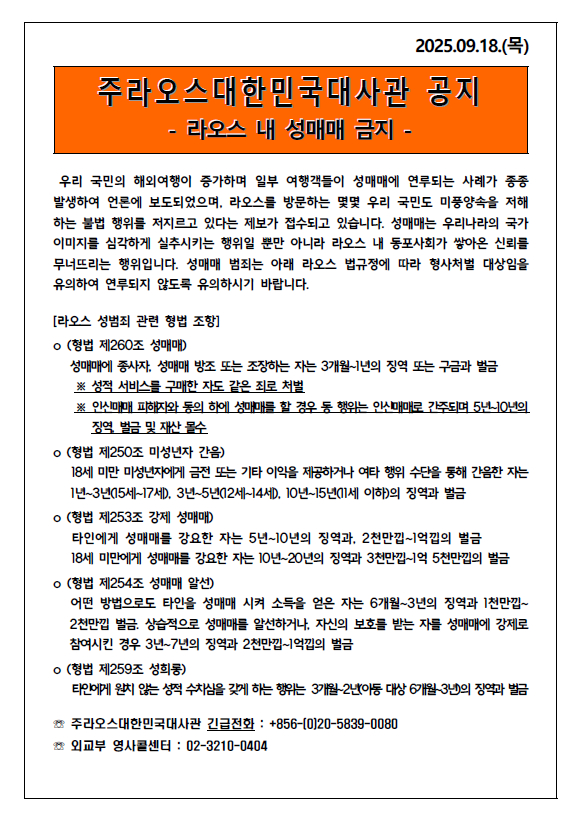 이어 “성매매는 라오스 법에 따라 엄격히 처벌되는 범죄로, 여행객들은 절대 연루되지 않도록 유의해야 한다”고 강조했습니다.