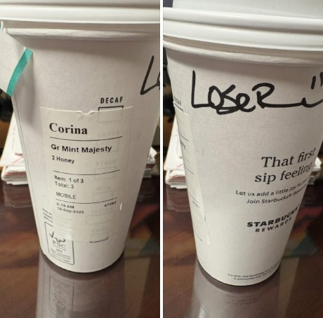 앞서 지난 16일에도 한 누리꾼이 찰리 커크 음료를 시킨 뒤 '루저(패배자)'라는 코멘트가 적힌 잔을 받았다며 인증 사진을 올려 큰 논란이 일었습니다.