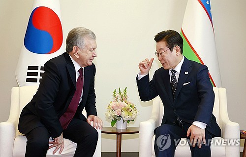 이재명 대통령, 한-우즈벡 정상회담(뉴욕=연합뉴스) 한상균 기자 = 이재명 대통령과 샤브카트 미르지요예프 우즈베키스탄 대통령이 23일(현지시간) 미국 뉴욕 유엔본부에서 정상회담을 하고 있다. 2025.9.24 xyz@yna.co.kr(뉴욕=연합뉴스) 한상균 기자 = 이재명 대통령과 샤브카트 미르지요예프 우즈베키스탄 대통령이 23일(현지시간) 미국 뉴욕 유엔본부에서 정상회담을 하고 있다. 2025.9.24 xyz@yna.co.kr