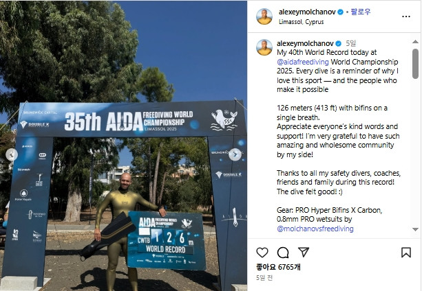 [BBC 캡처][BBC 캡처]지중해 동부의 섬나라 키프로스에서 열린 '2025 AIDA 뎁스 세계 선수권 대회'에서 알렉세이 몰차노프 선수가 무려 126m까지 잠수하며 자신의 40번째 세계 기록을 세웠습니다.
