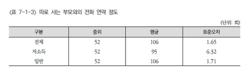 (서울=연합뉴스) 한국보건사회연구원이 지난해 수행한 제19차 한국복지패널 조사에 따르면 따로 사는 부모와 최근 1년 동안의 전화 통화 횟수는 중윗값 기준 52회, 평균 106회였다. [2024년 한국복지패널 조사·분석 보고서 갈무리. 재판매 및 DB 금지](서울=연합뉴스) 한국보건사회연구원이 지난해 수행한 제19차 한국복지패널 조사에 따르면 따로 사는 부모와 최근 1년 동안의 전화 통화 횟수는 중윗값 기준 52회, 평균 106회였다. [2024년 한국복지패널 조사·분석 보고서 갈무리. 재판매 및 DB 금지]따로 사는 부모와 최근 1년 동안의 전화 통화 횟수는 중윗값 기준 52회, 평균 106회였습니다.