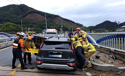 홍천 교통사고[강원특별자치도 소방본부 제공.재판매 및 DB 금지][강원특별자치도 소방본부 제공.재판매 및 DB 금지]오늘(7일) 오후 3시 45분쯤 강원 홍천군 화촌면의 한 교량에서 일가족 3명이 탄 승용차가 가드레일을 들이받았습니다.