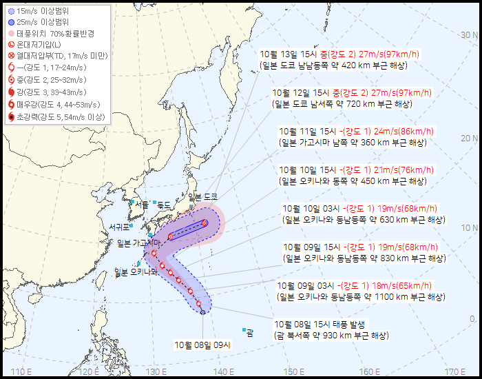 23호 태풍은 북서진하며 10일(금)쯤 일본 오키나와 동쪽 해상에 접근하겠고 규슈 남단에서 방향을 북동쪽으로 급격하게 틀어 일본 열도를 따라 이동할 전망입니다.