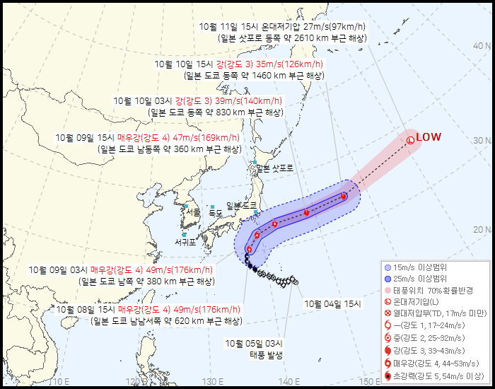 태풍 '할롱'은 11일(토)쯤 일본 삿포로 동쪽 먼 해상에서 온대저기압으로 변질될 전망입니다.